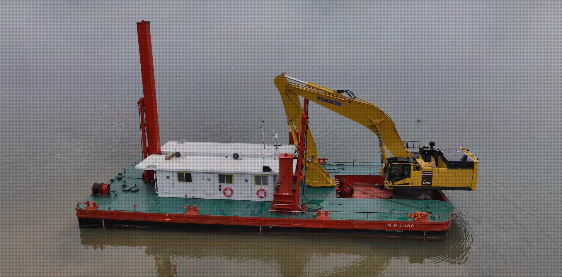2、施工平臺穩(wěn)性強,方便挖掘機在深水區(qū)施工作業(yè)。并且,平臺自帶航行動力,便于水上調(diào)遣。